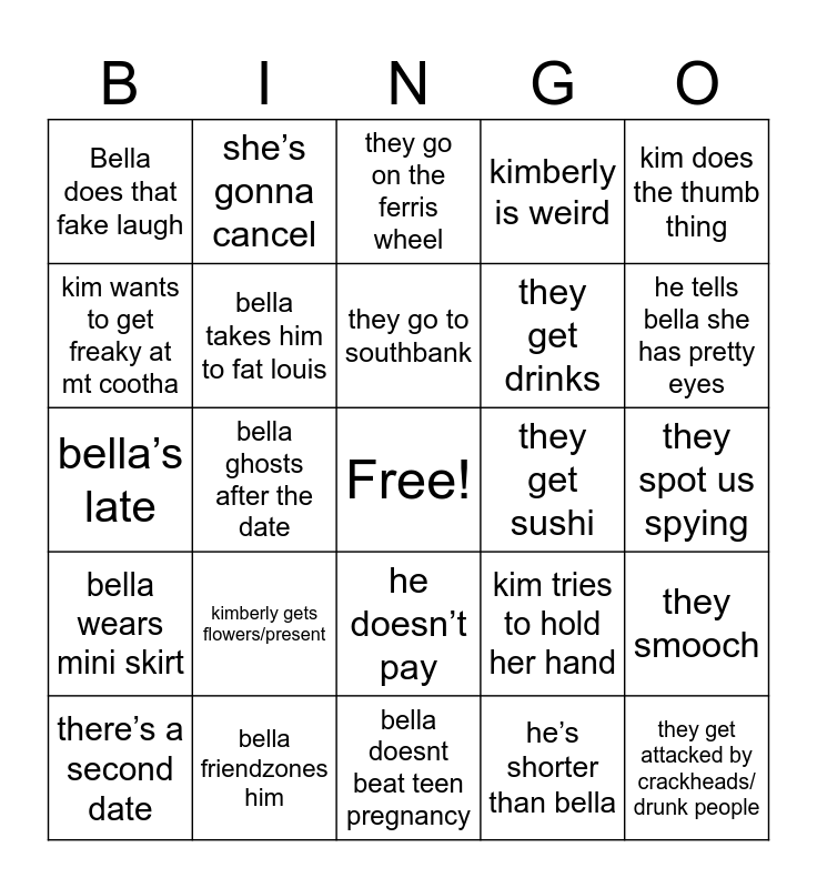 This bingo card has a free space and 24 words: kimberly gets flowers/present, bella friendzones him, they go to southbank, there’s a second date, kim does the thumb thing, Bella does that fake laugh, kim wants to get freaky at mt cootha, she’s gonna cancel, they get sushi, he doesn’t pay, they get drinks, bella’s late, kim tries to hold her hand, they smooch, bella takes him to fat louis, he’s shorter than bella, they spot us spying, they go on the ferris wheel, he tells bella she has pretty eyes, bella ghosts after the date, they get attacked by crackheads/ drunk people, bella wears mini skirt, kimberly is weird and bella doesnt beat teen pregnancy.