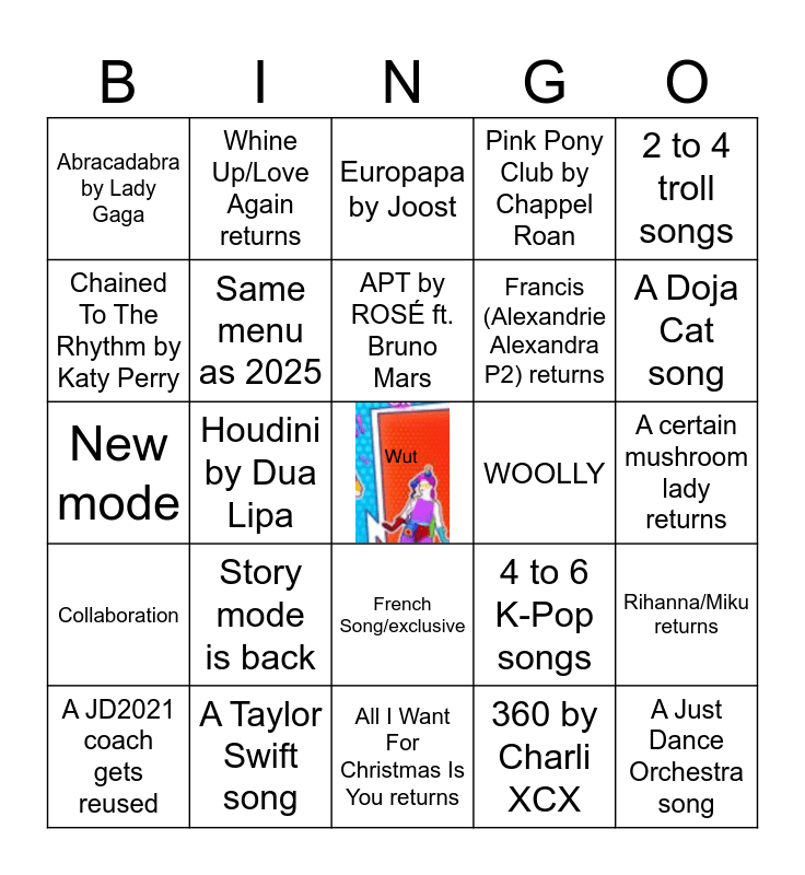 This bingo card has a free space and 24 words: Story mode is back, A Taylor Swift song, APT by ROSÉ ft. Bruno Mars, A JD2021 coach gets reused, 2 to 4 troll songs, Abracadabra by Lady Gaga, Chained To The Rhythm by Katy Perry, Whine Up/Love Again returns, WOOLLY, French Song/exclusive, Francis (Alexandrie Alexandra P2) returns, New mode, 4 to 6 K-Pop songs, Rihanna/Miku returns, Same menu as 2025, 360 by Charli XCX, A certain mushroom lady returns, Europapa by Joost, A Doja Cat song, Houdini by Dua Lipa, A Just Dance Orchestra song, Collaboration, Pink Pony Club by Chappel Roan and All I Want For Christmas Is You returns.