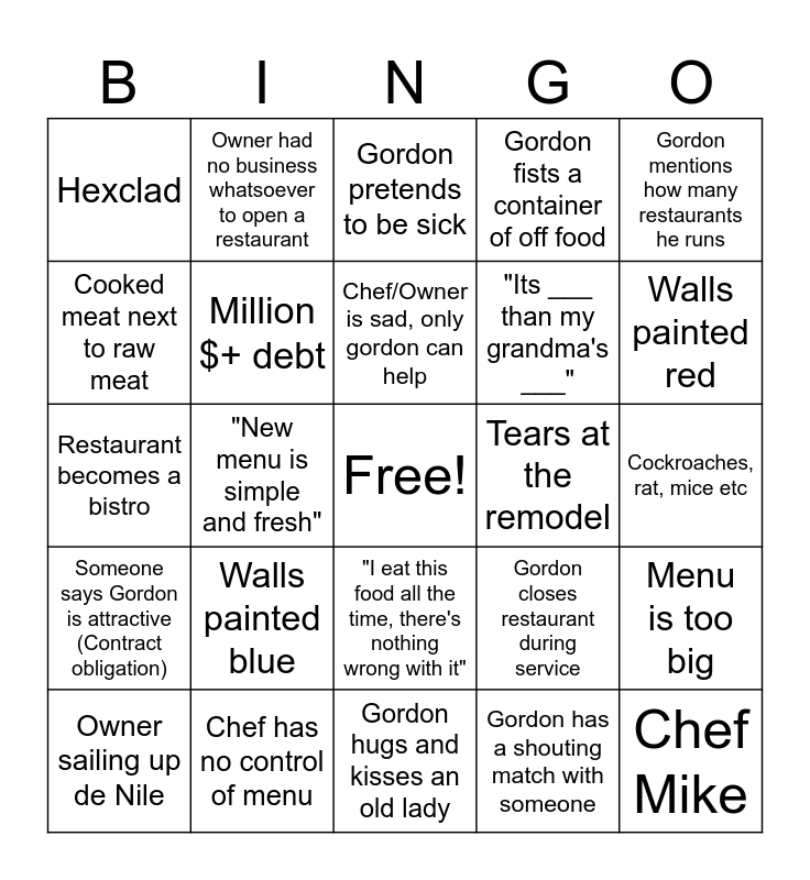 This bingo card has a free space and 24 words: Walls painted blue, Chef has no control of menu, Chef/Owner is sad, only gordon can help, Owner sailing up de Nile, Gordon mentions how many restaurants he runs, Hexclad, Cooked meat next to raw meat, Owner had no business whatsoever to open a restaurant, Tears at the remodel, "I eat this food all the time, there's nothing wrong with it", "Its ___ than my grandma's ___", Restaurant becomes a bistro, Gordon closes restaurant during service, Menu is too big, Million $+ debt, Gordon has a shouting match with someone, Cockroaches, rat, mice etc, Gordon pretends to be sick, Walls painted red, "New menu is simple and fresh", Chef Mike, Someone says Gordon is attractive (Contract obligation), Gordon fists a container of off food and Gordon hugs and kisses an old lady.