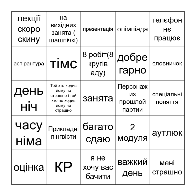 This bingo card has a free space and 24 words: Прикладні лінгвісти, КР, 8 робіт(8 кругів аду), оцінка, телєфон нє працює, лекції скоро скину, аспірантура, на вихідних занята ( шашлічкі), Персонаж из прошлой партии, багато сдаю, добре гарно, день ніч, 2 модуля, аутлюк, тімс, важкий день, спеціальні поняття, презентація, словничок, Той хто ходив йому не страшно і той хто не ходив йому не страшно, мені страшно, часу німа, олімпіада and я не хочу вас бачити.