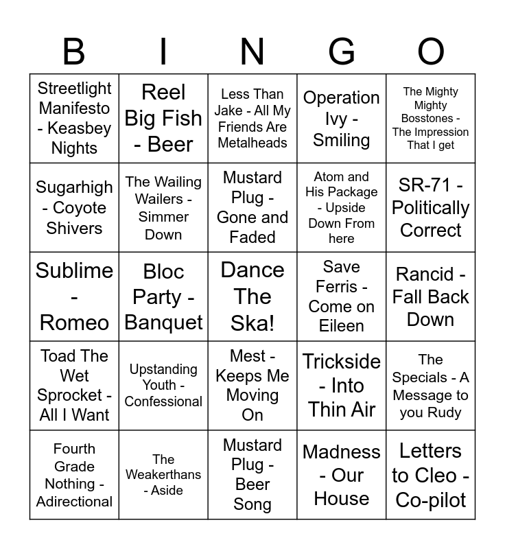 This bingo card has a free space and 24 words: Upstanding Youth - Confessional, The Weakerthans - Aside, Mustard Plug - Gone and Faded, Fourth Grade Nothing - Adirectional, The Mighty Mighty Bosstones - The Impression That I get, Streetlight Manifesto - Keasbey Nights, Sugarhigh - Coyote Shivers, Reel Big Fish - Beer, Save Ferris - Come on Eileen, Mest - Keeps Me Moving On, Atom and His Package - Upside Down From here, Sublime - Romeo, Trickside - Into Thin Air, The Specials - A Message to you Rudy, The Wailing Wailers - Simmer Down, Madness - Our House, Rancid - Fall Back Down, Less Than Jake - All My Friends Are Metalheads, SR-71 - Politically Correct, Bloc Party - Banquet, Letters to Cleo - Co-pilot, Toad The Wet Sprocket - All I Want, Operation Ivy - Smiling and Mustard Plug - Beer Song.