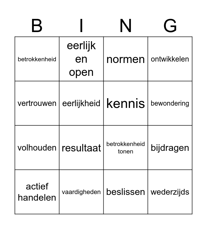 This bingo card has 16 words: vaardigheden, bijdragen, normen, betrokkenheid, volhouden, eerlijk en open, betrokkenheid tonen, beslissen, vertrouwen, eerlijkheid, actief handelen, ontwikkelen, resultaat, bewondering, kennis and wederzijds.