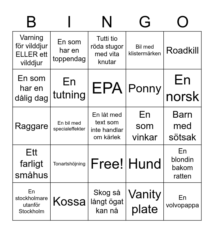 This bingo card has 26 words: Free!, Vanity plate, EPA, Kossa, Roadkill, Varning för vilddjur ELLER ett vilddjur, En som har en dålig dag, En som har en toppendag, Barn med sötsak, Hund, Ponny, Raggare, En blondin bakom ratten, En stockholmare utanför Stockholm, En bil med specialeffekter, Tutti tio rådjur, Bil med klistermärken, Ett farligt småhus, Tutti tio röda stugor med vita knutar, En låt med text som inte handlar om kärlek, En norsk, Skog så långt ögat kan nå, En som vinkar, Tonartshöjning, En tutning and En volvopappa.