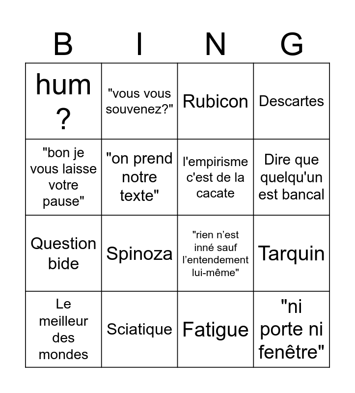 This bingo card has 16 words: Sciatique, Tarquin, Rubicon, hum ?, Question bide, "vous vous souvenez?", "rien n’est inné sauf l’entendement lui-même", Fatigue, "bon je vous laisse votre pause", "on prend notre texte", Le meilleur des mondes, Descartes, Spinoza, Dire que quelqu'un est bancal, l'empirisme c'est de la cacate and "ni porte ni fenêtre".