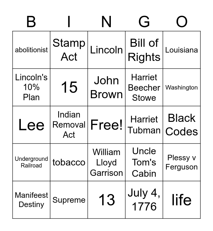 This bingo card has a free space and 24 words: tobacco, Supreme, John Brown, Manifeest Destiny, Louisiana, abolitionist, Lincoln's 10% Plan, Stamp Act, Harriet Tubman, William Lloyd Garrison, Harriet Beecher Stowe, Lee, Uncle Tom's Cabin, Plessy v Ferguson, 15, July 4, 1776, Black Codes, Lincoln, Washington, Indian Removal Act, life, Underground Railroad, Bill of Rights and 13.
