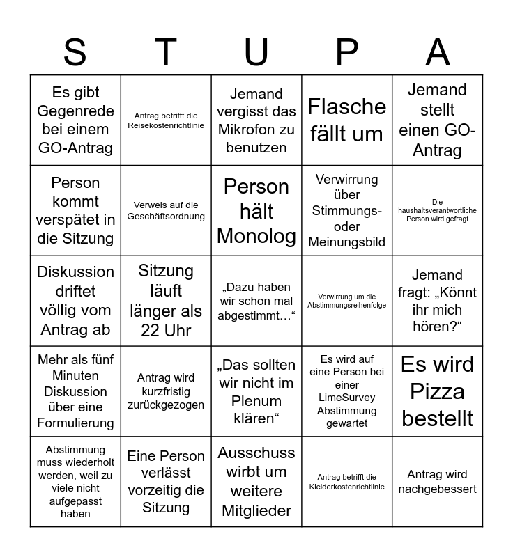 This bingo card has 38 words: Free!, Ein Antrag wird einstimmig angenommen, StuPa-Gast meldet sich zu Wort, Verweis auf die Geschäftsordnung, Es wird Pizza bestellt, Antrag wird kurzfristig zurückgezogen, Person hält Monolog, Beschlussfähigkeit wird während der Sitzung überprüft, Jemand stellt einen GO-Antrag, Verwirrung über Stimmungs- oder Meinungsbild, Sitzung läuft länger als 22 Uhr, Flasche fällt um, „Dazu haben wir schon mal abgestimmt…“, Jemand fragt: „Könnt ihr mich hören?“, Person kommt verspätet in die Sitzung, Mehr als fünf Minuten Diskussion über eine Formulierung, Ein unsichtbarer TO Punkt, Jemand vergisst das Mikrofon zu benutzen, Ein alter Konflikt wird wieder aufgerollt, Verwirrung um die Abstimmungsreihenfolge, Es gibt Gegenrede bei einem GO-Antrag, Eine Person verlässt vorzeitig die Sitzung, Die haushaltsverantwortliche Person wird gefragt, Abstimmung muss wiederholt werden, weil zu viele nicht aufgepasst haben, Tagesordnung wird umgestellt, Ausschuss wirbt um weitere Mitglieder, Antrag wird nachgebessert, „Gibt’s Gegenrede?“ – keine, trotzdem wird diskutiert, Verweis auf die Satzung, TO Punkt wird vorgezogen, weil Gäste nicht ewig Zeit haben, Die Redner:innenliste wird geschlossen, „Das sollten wir nicht im Plenum klären“, Antrag betrifft die Kleiderkostenrichtlinie, Antrag betrifft die Reisekostenrichtlinie, Haushaltsposten wird genehmigt, Es wird auf eine Person bei einer LimeSurvey Abstimmung gewartet, Diskussion driftet völlig vom Antrag ab and StuPa-Meme wird live in der Sitzung angesprochen.