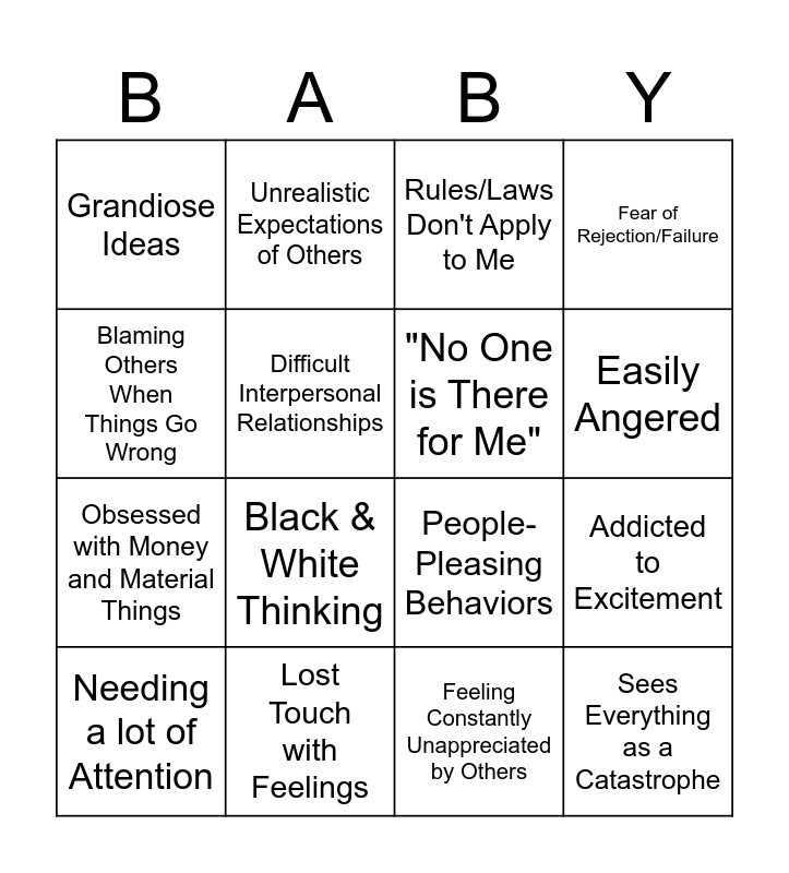 This bingo card has 16 words: Lost Touch with Feelings, Addicted to Excitement, Rules/Laws Don't Apply to Me, Grandiose Ideas, Obsessed with Money and Material Things, Unrealistic Expectations of Others, People-Pleasing Behaviors, Feeling Constantly Unappreciated by Others, Blaming Others When Things Go Wrong, Difficult Interpersonal Relationships, Needing a lot of Attention, Fear of Rejection/Failure, Black & White Thinking, Easily Angered, "No One is There for Me" and Sees Everything as a Catastrophe.