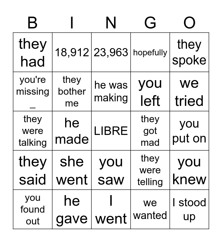 This bingo card has a free space and 29 words: you found out, I brought, he made, I said, they had, 23,963, they bother me, she went, they got mad, he gave, you put on, I stood up, I went, we wanted, we tried, I did, you saw, they said, they spoke, they were talking, they were telling, you have _ left, you left, you're missing _, hopefully, 18,912, you knew, he was making and 54,321.