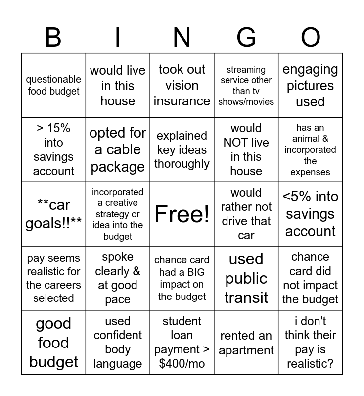 This bingo card has a free space and 24 words: spoke clearly & at good pace, used confident body language, explained key ideas thoroughly, good food budget, engaging pictures used, questionable food budget, > 15% into savings account, would live in this house, would rather not drive that car, chance card had a BIG impact on the budget, would NOT live in this house, **car goals!!**, used public transit, chance card did not impact the budget, opted for a cable package, rented an apartment, <5% into savings account, took out vision insurance, has an animal & incorporated the expenses, incorporated a creative strategy or idea into the budget, i don't think their pay is realistic?, pay seems realistic for the careers selected, streaming service other than tv shows/movies and student loan payment > $400/mo.