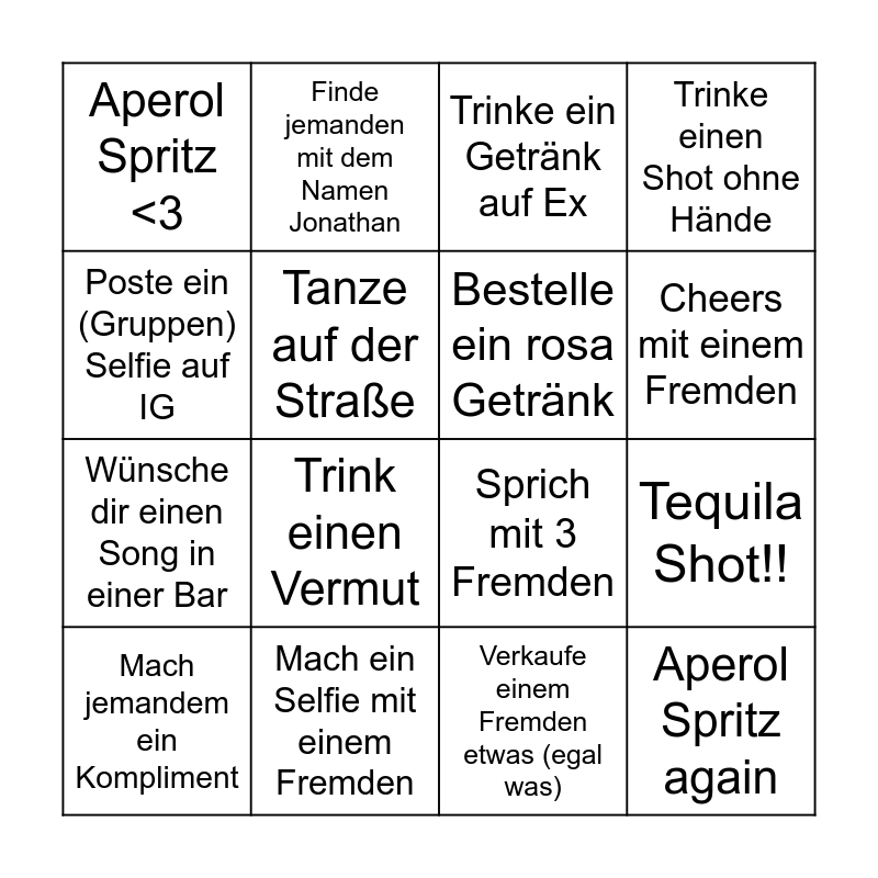This bingo card has 16 words: Mach ein Selfie mit einem Fremden, Tequila Shot!!, Trinke ein Getränk auf Ex, Aperol Spritz <3, Wünsche dir einen Song in einer Bar, Finde jemanden mit dem Namen Jonathan, Sprich mit 3 Fremden, Verkaufe einem Fremden etwas (egal was), Poste ein (Gruppen) Selfie auf IG, Tanze auf der Straße, Mach jemandem ein Kompliment, Trinke einen Shot ohne Hände, Trink einen Vermut, Cheers mit einem Fremden, Bestelle ein rosa Getränk and Aperol Spritz again.