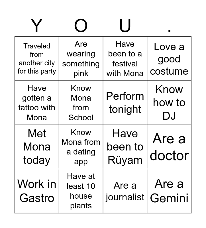 This bingo card has 24 words: Know Mona from a dating app, Studied Anthropology, Know how to DJ, Can schwäbisch schwätzen, Have gotten a tattoo with Mona, Traveled from another city for this party, Know Mona from School, Are wearing something pink, Have at least 10 house plants, Have a dog, Met Mona today, Have been to Rüyam, Are vegan, Have shared a bed with Mona, Perform tonight, Have been to another continent with Mona, Are a journalist, Have been to a festival with Mona, Know Mona from a dating app, Are a doctor, Work in Gastro, Are a Gemini, Love a good costume and Have lived in Leipzig.