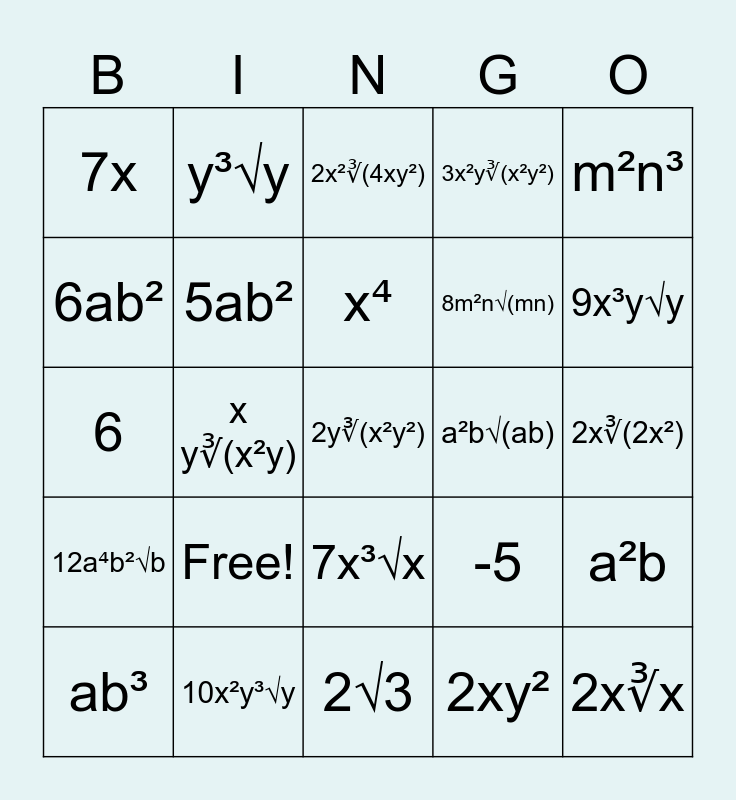 This bingo card has 25 words: Free!, 2√3, x⁴, ab³, m²n³, 7x, 6ab², y³√y, a²b√(ab), 7x³√x, 8m²n√(mn), 6, -5, a²b, 5ab², 2x∛x, 2x∛(2x²), 2x²∛(4xy²), 9x³y√y, x y∛(x²y), 2y∛(x²y²), 10x²y³√y, 12a⁴b²√b, 3x²y∛(x²y²) and 2xy².