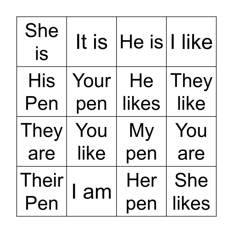 This bingo card has 16 words: I am, You are, He is, She is, They are, It is, My pen, Her pen, His Pen, Your pen, Their Pen, I like, You like, They like, He likes and She likes.