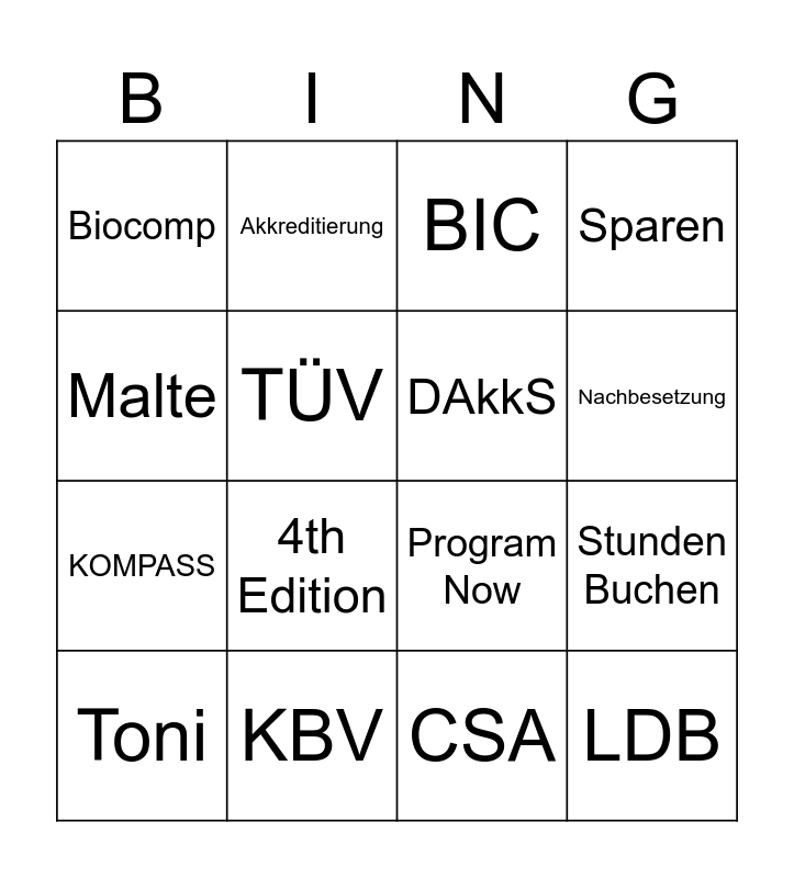 This bingo card has 16 words: KBV, Stunden Buchen, BIC, Biocomp, KOMPASS, Akkreditierung, Program Now, CSA, Malte, TÜV, Toni, Sparen, 4th Edition, Nachbesetzung, DAkkS and LDB.