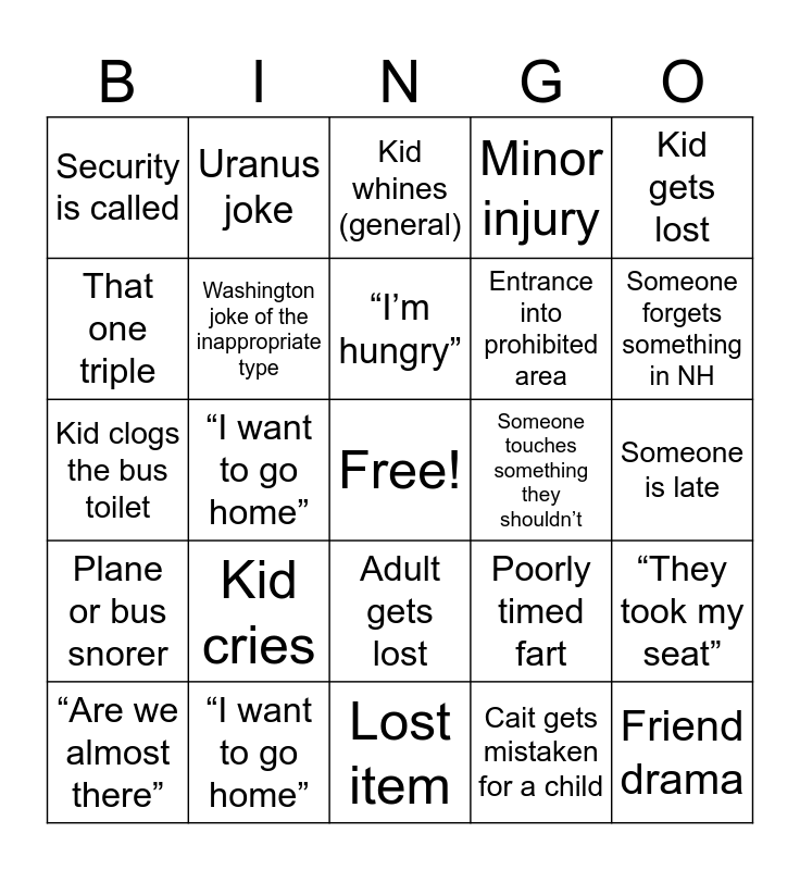 This bingo card has a free space and 24 words: Kid cries, “I want to go home”, “I’m hungry”, “Are we almost there”, Kid gets lost, Security is called, That one triple, Uranus joke, Someone touches something they shouldn’t, Adult gets lost, Entrance into prohibited area, Kid clogs the bus toilet, Poorly timed fart, “They took my seat”, Washington joke of the inappropriate type, Cait gets mistaken for a child, Someone is late, Kid whines (general), Someone forgets something in NH, “I want to go home”, Friend drama, Plane or bus snorer, Minor injury and Lost item.