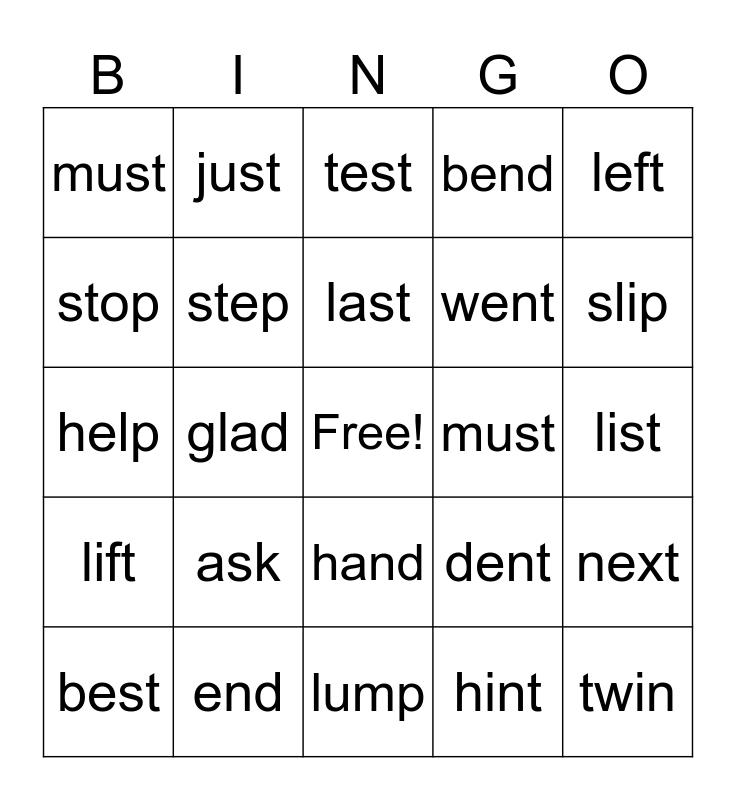 This bingo card has a free space and 24 words: ask, end, last, best, left, must, stop, just, must, hand, went, help, dent, next, step, hint, list, test, slip, glad, twin, lift, bend and lump.