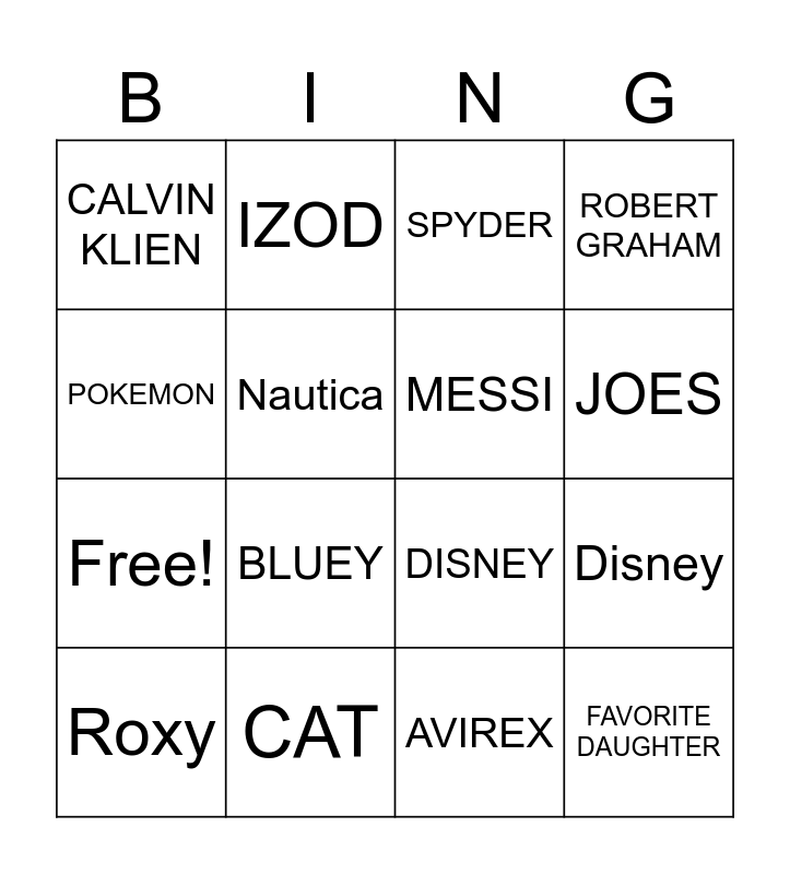 This bingo card has 24 words: BUFFALO JEANS, HUDSON JEANS, AVIREX, FAVORITE DAUGHTER, CALVIN KLIEN, IZOD, MESSI, ROBERT GRAHAM, Free!, CAT, TOMMY HILFILGER, JOES, JUICY COUTURE, MARVEL, DISNEY, Under Armour, Roxy, Nautica, Billabong, Disney, POKEMON, BLUEY, SPYDER and LUCKY BRAND.