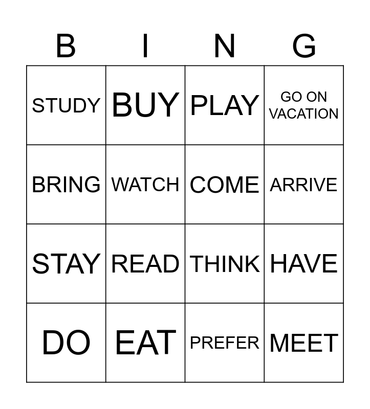 This bingo card has 20 words: HAVE, TAKE, PLAY, LIVE, DO, BRING, EAT, STUDY, STAY, BUY, READ, THINK, WATCH, MEET, COME, GO OUT, ARRIVE, GO ON VACATION, PREFER and SEE.