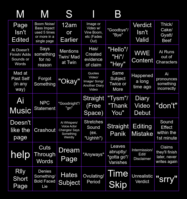 This bingo card has a free space and 53 words: Hates Subject, WWE Content, "lol", "Goodnight"/ "gn", "Okay", Sound Effect within the 1st minute, Boom Noise/ Bass Impact used 5 times or more in a single page, Cringe, Verdict Isn't Valid, help, Thick/ Cake/ Gyatt/ Beef, Straight Panik, Happened a long time ago, Same Subject Twice or More, Intermission/ Edit/ Disclaimer, Ai pronounces something incorrectly, Ai Doesn't Finish/ Adds Sounds or Words, Ai Runs out of Characters, Ovulating/ Period, "Goodbye"/ "Bye", "Hello"/ "Hi"/ "Hey", "srry", Says something for no reason, Page Isn't Edited, Time Skip, Ai Music, Doesn't like the page, Unrealistic Verdict, "don't", Mentions Twin/ Mad at Twin, Insane Synesthesia Backdrop/ Animated Backdrop (or just pretty in general), Stretches Sound (ex. "Ughhh"), Leaves abruptly/ "gotta go"/ Vanishes, Claims they'll finish later, never writes again, Editing Mistake, Crashout, Image or Video w/ Vine Boom, etc (Fades Out), NPC Statement, 12am or Earlier, Cuts Through Words, Dream Page, "Anyways", Mad at Past Self (in any way), Sleep/ Nap/ Mentions Bed, Rlly Short Page, Quotes Video/ Image/ Song/ Another Diary Video, Diary Video Debut, Ai Whispers/ Voice Actor Changes/ Says Something Weirdly, Has/ Created evidence of claim, Forgot Something, Denies Something/ Bold Faced Lie, "Tysm"/ "Thank You" and shut up/ shut tf up/ shut/ shut it.