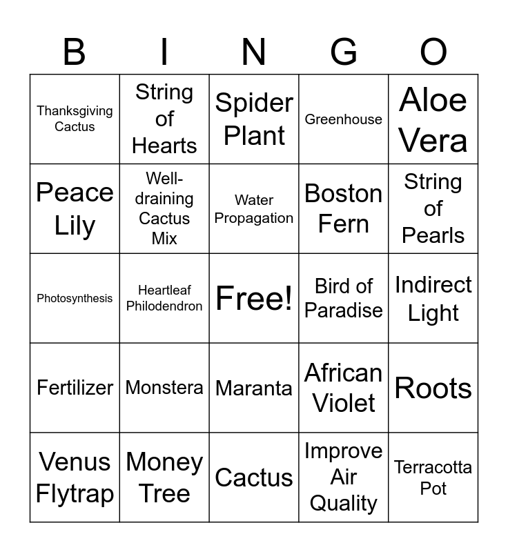 This bingo card has a free space and 24 words: Monstera, Money Tree, Water Propagation, Venus Flytrap, Aloe Vera, Thanksgiving Cactus, Peace Lily, String of Hearts, Bird of Paradise, Maranta, Boston Fern, Photosynthesis, African Violet, Roots, Well-draining Cactus Mix, Improve Air Quality, Indirect Light, Spider Plant, String of Pearls, Heartleaf Philodendron, Terracotta Pot, Fertilizer, Greenhouse and Cactus.