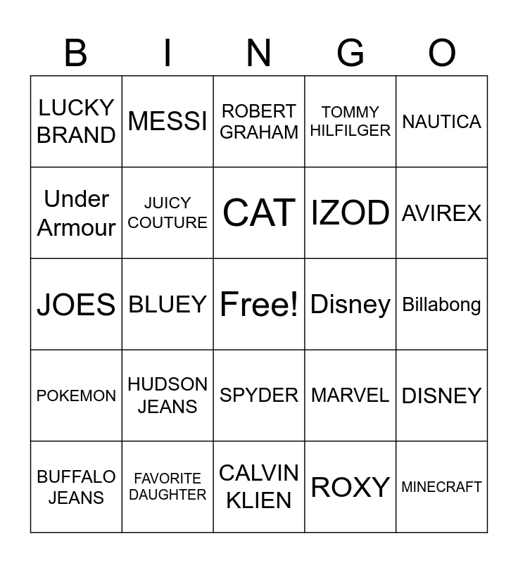 This bingo card has a free space and 24 words: BUFFALO JEANS, HUDSON JEANS, CAT, ROXY, NAUTICA, LUCKY BRAND, MESSI, ROBERT GRAHAM, Disney, Billabong, JOES, JUICY COUTURE, MARVEL, DISNEY, Under Armour, FAVORITE DAUGHTER, CALVIN KLIEN, TOMMY HILFILGER, AVIREX, POKEMON, BLUEY, SPYDER, IZOD and MINECRAFT.