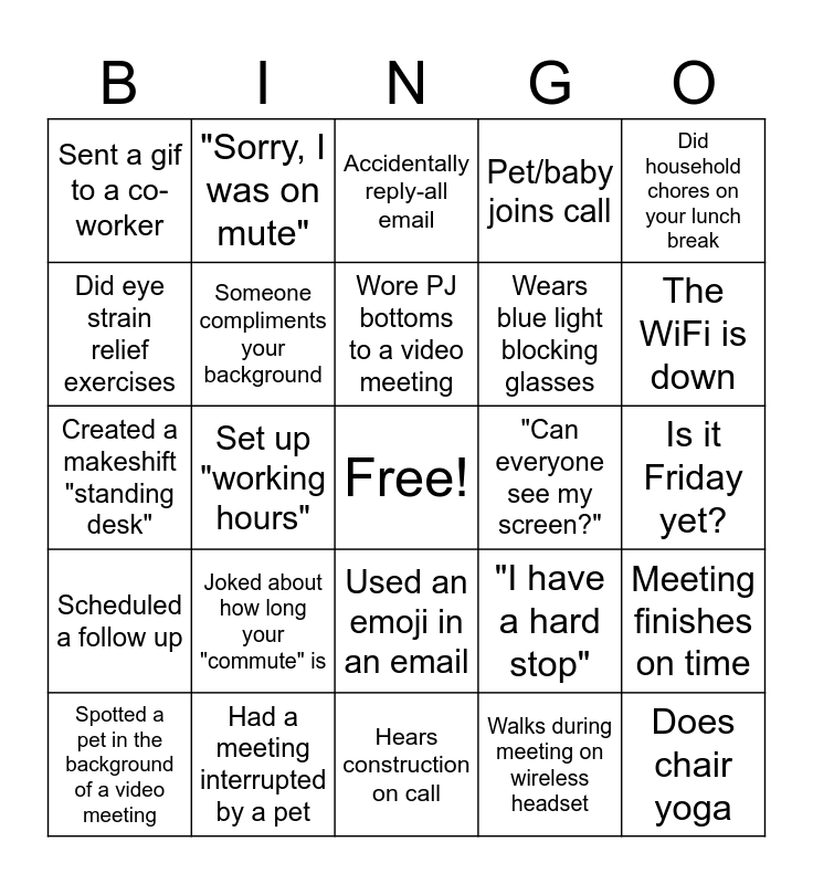 This bingo card has a free space and 24 words: Joked about how long your "commute" is, Had a meeting interrupted by a pet, Wore PJ bottoms to a video meeting, Spotted a pet in the background of a video meeting, Did household chores on your lunch break, Sent a gif to a co-worker, Did eye strain relief exercises, "Sorry, I was on mute", "Can everyone see my screen?", Used an emoji in an email, Wears blue light blocking glasses, Created a makeshift "standing desk", "I have a hard stop", Meeting finishes on time, Someone compliments your background, Walks during meeting on wireless headset, Is it Friday yet?, Accidentally reply-all email, The WiFi is down, Set up "working hours", Does chair yoga, Scheduled a follow up, Pet/baby joins call and Hears construction on call.