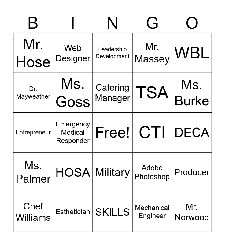 This bingo card has a free space and 24 words: HOSA, Esthetician, Catering Manager, Chef Williams, WBL, Mr. Hose, Dr. Mayweather, Web Designer, CTI, Military, TSA, Entrepreneur, Adobe Photoshop, Producer, Ms. Goss, Mechanical Engineer, DECA, Leadership Development, Ms. Burke, Emergency Medical Responder, Mr. Norwood, Ms. Palmer, Mr. Massey and SKILLS.