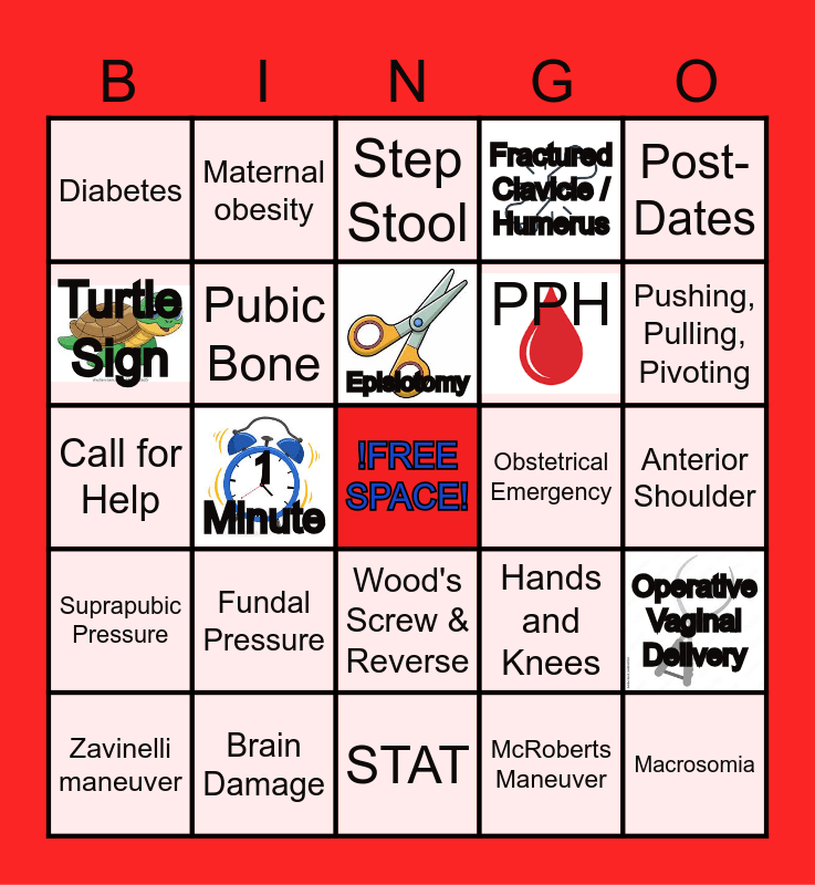 This bingo card has 6 images, a free space and 24 words: Fundal Pressure, Brain Damage, Episiotomy, Zavinelli maneuver, Post-Dates, Diabetes, Turtle Sign, Maternal obesity, Obstetrical Emergency, Wood's Screw & Reverse, PPH, Call for Help, Hands and Knees, Operative Vaginal Delivery, Pubic Bone, McRoberts Maneuver, Anterior Shoulder, Step Stool, Pushing, Pulling, Pivoting, 1 Minute, Macrosomia, Suprapubic Pressure, Fractured Clavicle / Humerus and STAT.