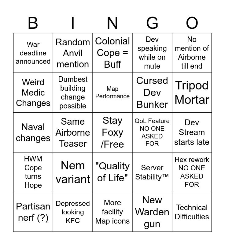 This bingo card has a free space and 30 words: Depressed looking KFC, Shotgun Nerf, Same Airborne Teaser, "The Vision", War deadline announced, Colonial Cope = Buff, Dumbest building change possible, "Quality of Life", QoL Feature NO ONE ASKED FOR, More facility Map icons, Dev Stream starts late, Technical Difficulties, New Warden gun, New Colonial gun, Tripod Mortar, More Facility locked stuff, Server Stability™, HWM Cope turns Hope, Nem variant, No mention of Airborne till end, Naval changes, Ballista changes (?), Random Anvil mention, Cursed Dev Bunker, Weird Medic Changes, Dev speaking while on mute, Hex rework NO ONE ASKED FOR, Partisan nerf (?), Map Performance and MORE CONTAINER COLORS!!!.