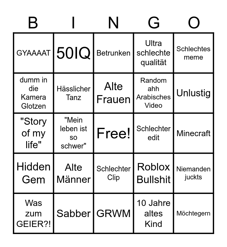 This bingo card has a free space and 24 words: Alte Männer, Sabber, Alte Frauen, Was zum GEIER?!, Schlechtes meme, GYAAAAT, dumm in die Kamera Glotzen, 50IQ, Schlechter edit, Schlechter Clip, Random ahh Arabisches Video, "Story of my life", Roblox Bullshit, Niemanden juckts, Hässlicher Tanz, 10 Jahre altes Kind, Minecraft, Betrunken, Unlustig, "Mein leben ist so schwer", Möchtegern, Hidden Gem, Ultra schlechte qualität and GRWM.