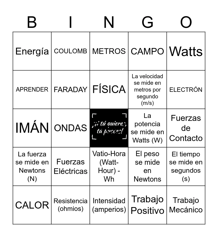 This bingo card has a free space and 74 words: MOVIMIENTO, NEWTON, METROS, FUERZA, VELOCIDAD, ACELERACIÓN, MASA, CONSERVACIÓN, CALOR, ENERGÍA, TERMÓMETRO, TEMPERATURA, FÍSICA, APRENDER, JOULE, ONDAS, LUZ, ELECTRÓN, PROTÓN, IMÁN, FARADAY, COULOMB, CAMPO, CIRCUITOS, Trabajo Mecánico, Potencia Mecánica, Energía Mecánica, Energía Potencial, Energía Cinética, Potencia Eléctrica, Watts, Horse Power, Caballo de Vapor, Trabajo Negativo, Trabajo Nulo, Trabajo Positivo, Joules, Ley de Ohm, Corriente Eléctrica, Tensión (voltaje), Intensidad (amperios), Resistencia (ohmios), Potencia (vatios), Energía Eléctrica, Carga Eléctrica, Energía, Magnitudes Eléctricas, Fuerzas Eléctricas, Fuerzas Magnéticas, 4 Propiedades Básicas de la Energía, Tipos de Energía, Fuerzas Fundamentales, Fuerzas de Contacto, Fuerzas a Distancia, Circuitos Eléctricos Abiertos y Cerrados, Tonelada, Vatio-Hora (Watt-Hour) - Wh, KiloWatt - kW, La distancia se mide en metros (m), El tiempo se mide en segundos (s), La velocidad se mide en metros por segundo (m/s), La aceleración se mide en metros por segundos cuadrados (m/s2), La fuerza se mide en Newtons (N), La energía se mide en Joules (J), La potencia se mide en Watts (W), La gravedad equivale a 9.81 m/s2, La gravedad es una aceleración, La gravedad es una fuerza, El peso se mide en Newtons, El peso es el resultado de la masa por la gravedad, La masa se mide en kilogramos (kg), La intensidad se mide en Amperes (A), El voltaje se mide en Volts (V) and La resistencia se mide en Ohms.