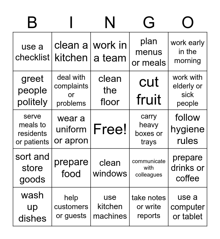 This bingo card has a free space and 24 words: prepare food, help customers or guests, clean the floor, wash up dishes, work early in the morning, use a checklist, greet people politely, clean a kitchen, carry heavy boxes or trays, clean windows, cut fruit, serve meals to residents or patients, communicate with colleagues, prepare drinks or coffee, deal with complaints or problems, take notes or write reports, follow hygiene rules, work in a team, work with elderly or sick people, wear a uniform or apron, use a computer or tablet, sort and store goods, plan menus or meals and use kitchen machines.