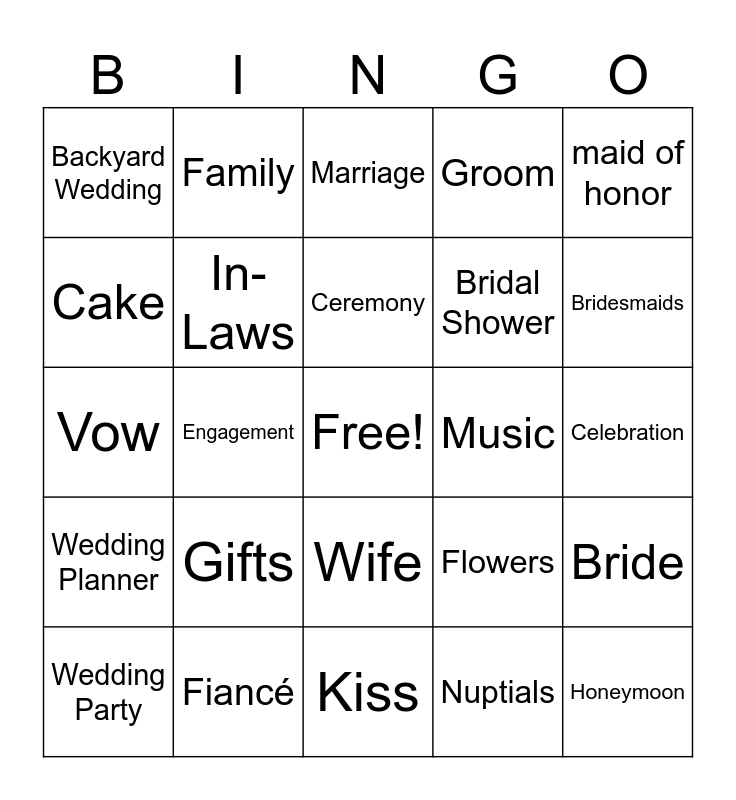 This bingo card has a free space and 51 words: Wedding, Honeymoon, Love, Kiss, Gifts, Money, Family, Wedding Dress, Cake, Dancing, In-Laws, Groom, Bride, Flowers, Food, Toasts, Ceremony, Music, best man, maid of honor, Engagement, Nuptials, Backyard Wedding, Bridal Shower, Wedding Bells, Rings, Bridesmaids, Groomsmen, Wedding Party, Marriage, Bachelor Party, Bachelorette Party, Tux, Flower Girl, Ring Bearer, Fiancé, Party, Newlyweds, Josh, Isabelle, Celebration, Wedding Planner, Photos, Centerpieces, Father of the Bride, Mother of the Bride, Vow, First Look, Husband, Wife and First Dance.