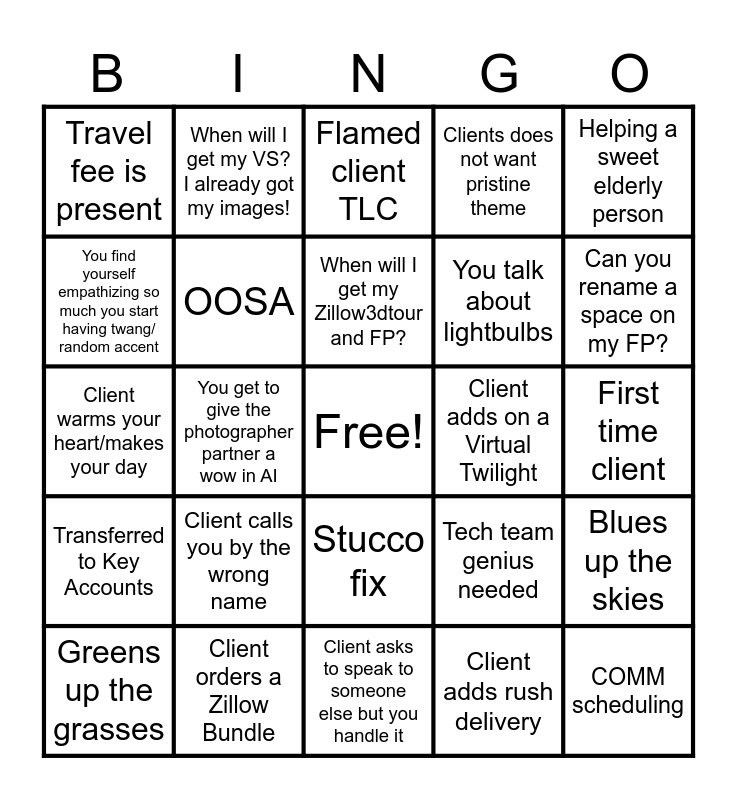 This bingo card has a free space and 24 words: Client calls you by the wrong name, Client orders a Zillow Bundle, When will I get my Zillow3dtour and FP?, Greens up the grasses, Helping a sweet elderly person, Travel fee is present, You find yourself empathizing so much you start having twang/ random accent, When will I get my VS? I already got my images!, Client adds on a Virtual Twilight, Stucco fix, You talk about lightbulbs, Client warms your heart/makes your day, Tech team genius needed, Blues up the skies, OOSA, Client adds rush delivery, First time client, Flamed client TLC, Can you rename a space on my FP?, You get to give the photographer partner a wow in AI, COMM scheduling, Transferred to Key Accounts, Clients does not want pristine theme and Client asks to speak to someone else but you handle it.