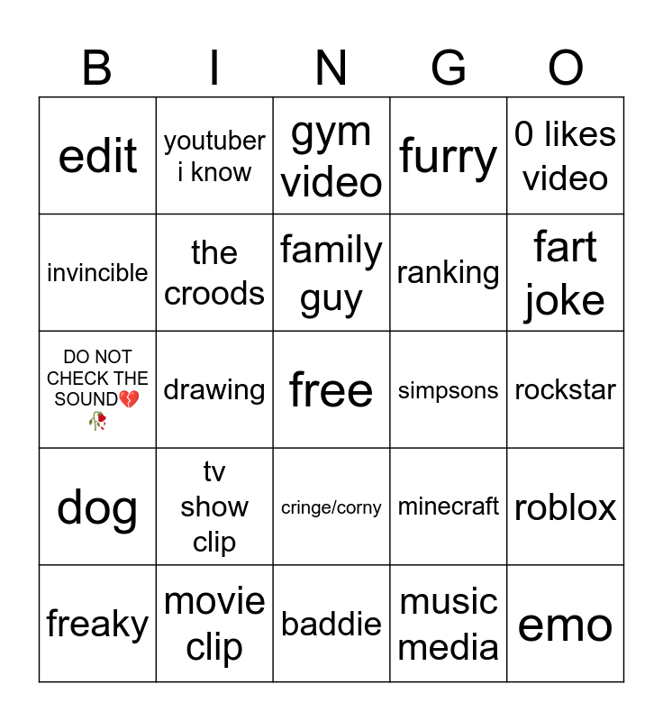This bingo card has a free space and 24 words: tv show clip, movie clip, family guy, freaky, 0 likes video, edit, invincible, youtuber i know, simpsons, cringe/corny, ranking, DO NOT CHECK THE SOUND💔🥀, minecraft, roblox, the croods, music media, rockstar, gym video, fart joke, drawing, emo, dog, furry and baddie.