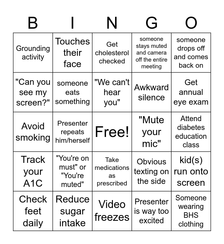 This bingo card has a free space and 49 words: "Can you repeat that?", Someone wearing BHS clothing, Pet comes into screen, Video freezes, "You're on must" or "You're muted", Joins late and apologizes, Touches their face, Talking at the same time/interrupting, "Can you see my screen?", Forehead only on the web cam, someone eats something, someone stays muted and camera off the entire meeting, kid(s) run onto screen, Obvious texting on the side, someone drinks something, someone is closely examining their screen, "We can't hear you", "Mute your mic", "weird" background noise, someone drops off and comes back on, Presenter repeats him/herself, Presenter is way too excited, Grounding activity, Awkward silence, Monitor blood sugar daily, Get annual eye exam, Check feet daily, Eat more fiber, Take medications as prescribed, Track your A1C, Drink more water, Limit processed foods, Stay physically active, Get flu shot every year, Reduce sugar intake, Manage stress, See doctor every 3-6 months, Check blood pressure regularly, Attend diabetes education class, Inspect shoes for safety, Avoid skipping meals, Keep a food journal, Brush and floss daily, Limit alcohol intake, Avoid smoking, Get cholesterol checked, Read nutrition labels, Eat healthy snacks and Free Space.