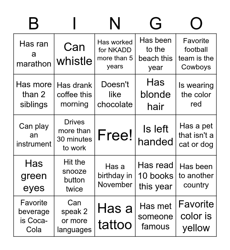This bingo card has a free space and 24 words: Hit the snooze button twice, Can speak 2 or more languages, Doesn't like chocolate, Favorite beverage is Coca-Cola, Favorite football team is the Cowboys, Has ran a marathon, Has more than 2 siblings, Can whistle, Is left handed, Has a birthday in November, Has blonde hair, Can play an instrument, Has read 10 books this year, Has been to another country, Has drank coffee this morning, Has met someone famous, Has a pet that isn't a cat or dog, Has worked for NKADD more than 5 years, Is wearing the color red, Drives more than 30 minutes to work, Favorite color is yellow, Has green eyes, Has been to the beach this year and Has a tattoo.