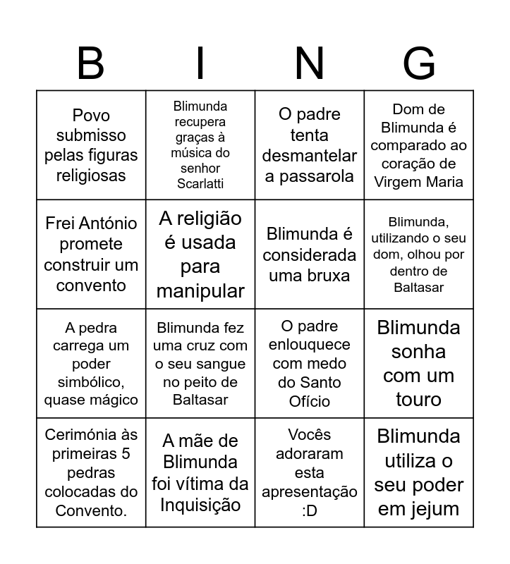This bingo card has 16 words: A mãe de Blimunda foi vítima da Inquisição, Blimunda sonha com um touro, O padre tenta desmantelar a passarola, Povo submisso pelas figuras religiosas, A pedra carrega um poder simbólico, quase mágico, Blimunda recupera graças à música do senhor Scarlatti, O padre enlouquece com medo do Santo Ofício, Vocês adoraram esta apresentação :D, Frei António promete construir um convento, A religião é usada para manipular, Cerimónia às primeiras 5 pedras colocadas do Convento., Dom de Blimunda é comparado ao coração de Virgem Maria, Blimunda fez uma cruz com o seu sangue no peito de Baltasar, Blimunda, utilizando o seu dom, olhou por dentro de Baltasar, Blimunda é considerada uma bruxa and Blimunda utiliza o seu poder em jejum.