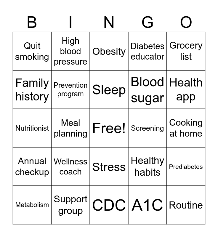 This bingo card has a free space and 28 words: Prediabetes, Insulin, Blood sugar, A1C, Family history, Obesity, High blood pressure, Annual checkup, Screening, Metabolism, Nutritionist, Diabetes educator, Support group, CDC, Health app, Glucometer, Wellness coach, Prevention program, Sleep, Stress, Quit smoking, Hydration, Routine, Meal planning, Cooking at home, Healthy habits, Grocery list and Mindful eating.