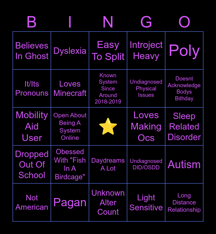 This bingo card has a free space and 24 words: Obessed With "Fish In A Birdcage", Pagan, Known System Since Around 2018-2019, Not American, Poly, Believes In Ghost, It/Its Pronouns, Dyslexia, Loves Making Ocs, Daydreams A Lot, Undiagnosed Physical Issues, Mobility Aid User, Undiagnosed DID/OSDD, Autism, Loves Minecraft, Light Sensitive, Sleep Related Disorder, Easy To Split, Doesnt Acknowledge Bodys Bithday, Open About Being A System Online, Long Distance Relationship, Dropped Out Of School, Introject Heavy and Unknown Alter Count.