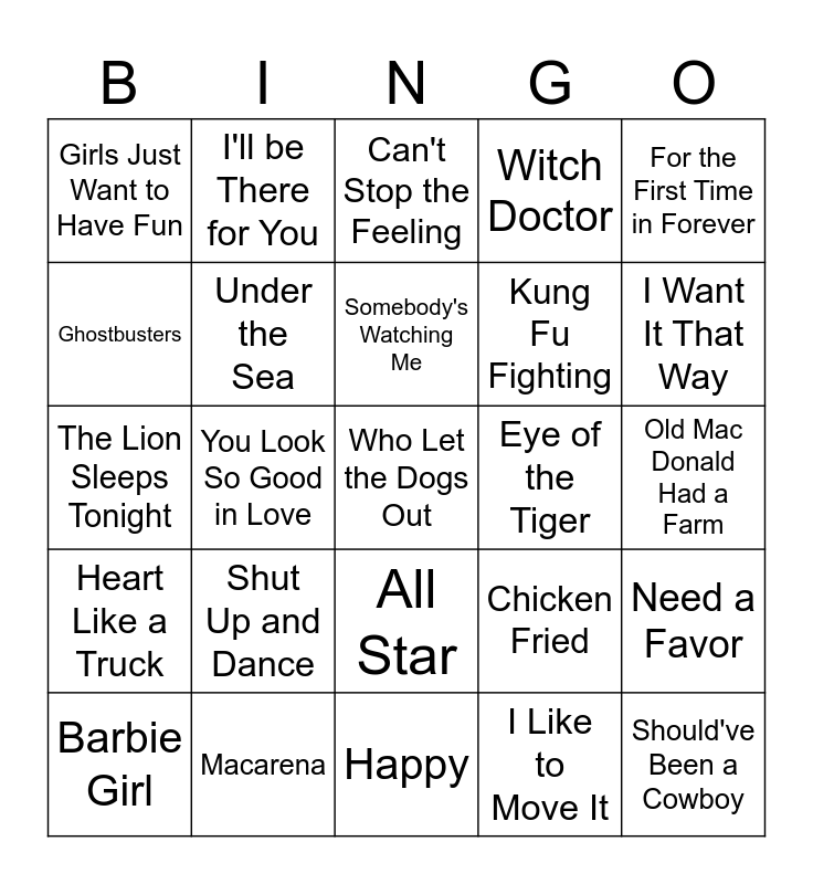 This bingo card has 45 words: Baby Shark, Who Let the Dogs Out, Y.M.C.A., Barbie Girl, Firework, I Like to Move It, Can't Stop the Feeling, Get Back Up Again, For the First Time in Forever, Macarena, Witch Doctor, Eye of the Tiger, All Star, Shut Up and Dance, U Can't Touch This, Happy, I'm Still Standing, The Lion Sleeps Tonight, Baby, I Want It That Way, I'll be There for You, Sweet Caroline, You're the One That I Want, Girls Just Want to Have Fun, Walking on Sunshine, Old Mac Donald Had a Farm, Bad Romance, Neon Moon, Chicken Fried, Heart Like a Truck, Dancin' In The Country, Need a Favor, Fast Car, Watermelon Moonshine, Ends of the Earth, You Look So Good in Love, Forever and Ever, Amen, Popular, Should've Been a Cowboy, Somebody's Watching Me, Ghostbusters, Kung Fu Fighting, You've Got a Friend in Me, Under the Sea and Hakuna Matata.