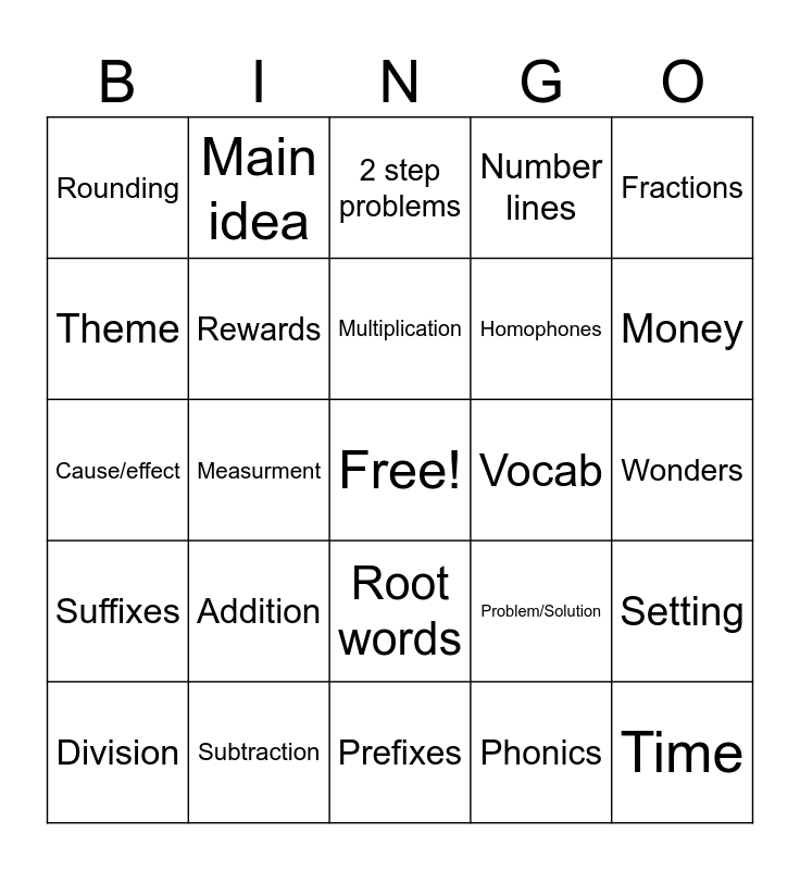 This bingo card has a free space and 24 words: Addition, Subtraction, Multiplication, Division, Fractions, Rounding, Theme, Main idea, Vocab, Root words, Homophones, Cause/effect, Problem/Solution, Setting, Rewards, Phonics, Wonders, 2 step problems, Money, Measurment, Time, Suffixes, Number lines and Prefixes.