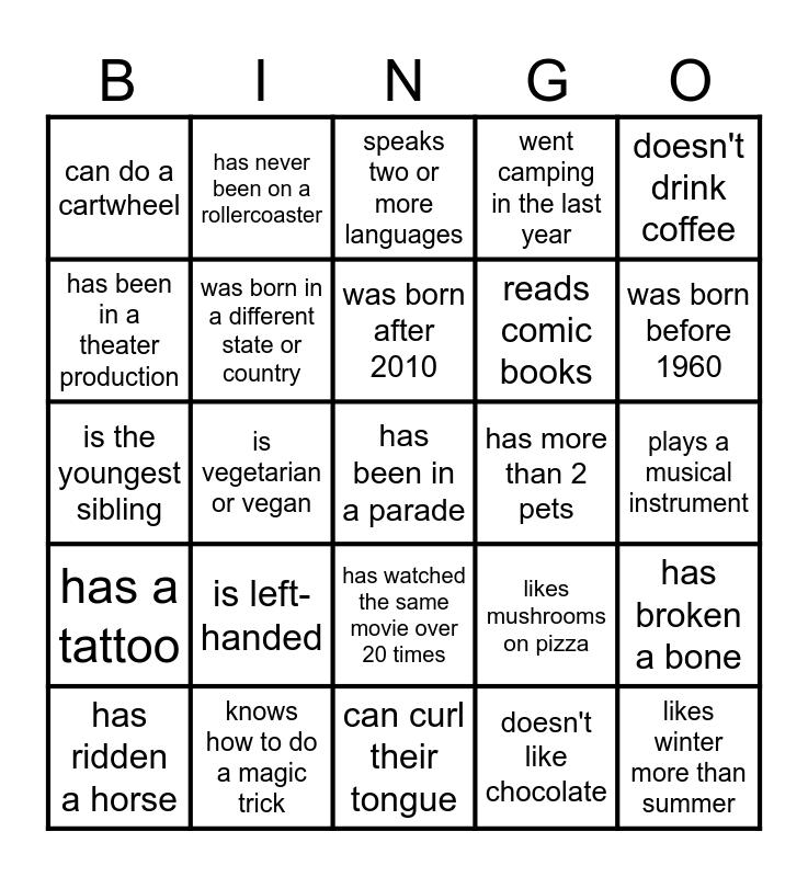 This bingo card has a free space and 24 words: is left-handed, knows how to do a magic trick, was born after 2010, has ridden a horse, doesn't drink coffee, can do a cartwheel, has been in a theater production, has never been on a rollercoaster, has more than 2 pets, has watched the same movie over 20 times, reads comic books, is the youngest sibling, likes mushrooms on pizza, has broken a bone, was born in a different state or country, doesn't like chocolate, plays a musical instrument, speaks two or more languages, was born before 1960, is vegetarian or vegan, likes winter more than summer, has a tattoo, went camping in the last year and can curl their tongue.