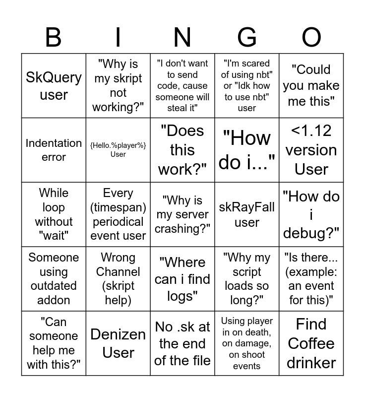 This bingo card has a free space and 24 words: Wrong Channel (skript help), Denizen User, "Does this work?", "Can someone help me with this?", "Could you make me this", SkQuery user, Indentation error, "Why is my skript not working?", skRayFall user, "Where can i find logs", "How do i...", While loop without "wait", "Why my script loads so long?", "Is there... (example: an event for this)", {Hello.%player%} User, Using player in on death, on damage, on shoot events, "How do i debug?", "I don't want to send code, cause someone will steal it", <1.12 version User, Every (timespan) periodical event user, Find Coffee drinker, Someone using outdated addon, "I'm scared of using nbt" or "Idk how to use nbt" user and No .sk at the end of the file.