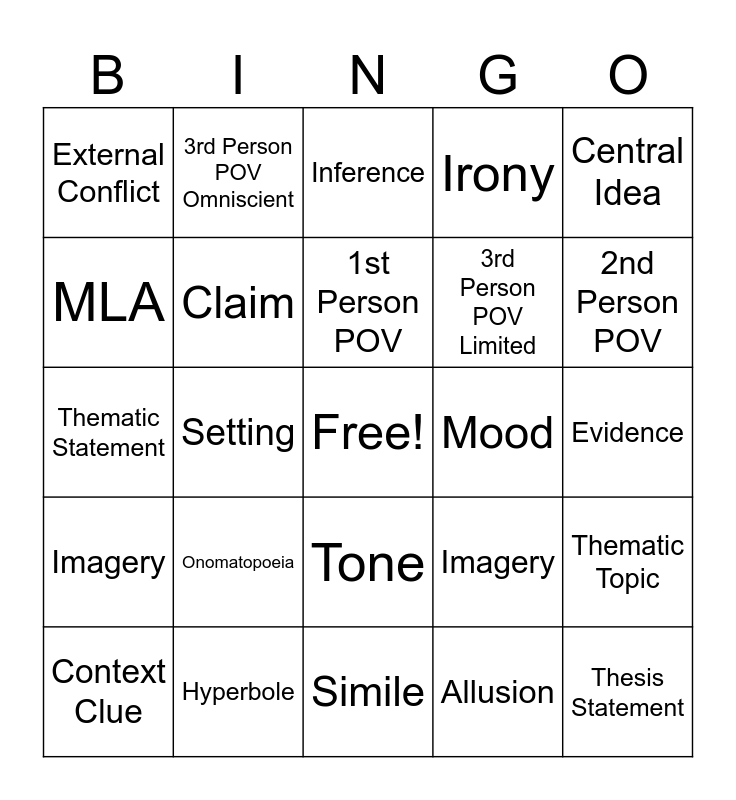 This bingo card has a free space and 24 words: Onomatopoeia, Hyperbole, 1st Person POV, Context Clue, Central Idea, External Conflict, MLA, 3rd Person POV Omniscient, Mood, Tone, 3rd Person POV Limited, Thematic Statement, Imagery, Thematic Topic, Claim, Allusion, Evidence, Inference, 2nd Person POV, Setting, Thesis Statement, Imagery, Irony and Simile.