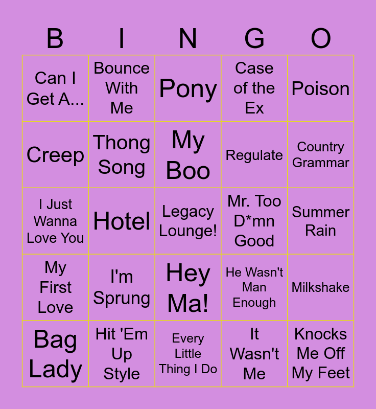 This bingo card has a free space and 34 words: My Love, It Wasn't Me, Let's Get Married, Dilemma, My First Love, Thong Song, Poison, Bag Lady, Bounce With Me, Heartbreaker, My Boo, Pony, No Scrubs, Say My Name, Mr. Too D*mn Good, Country Grammar, Hit 'Em Up Style, I Just Wanna Love You, I'm Sprung, He Wasn't Man Enough, Hey Ma!, No Diggity, Can I Get A..., Summer Rain, Every Little Thing I Do, Knocks Me Off My Feet, Case of the Ex, Real Love, Regulate, Creep, Party Up, Hotel, Milkshake and 21 Questions.