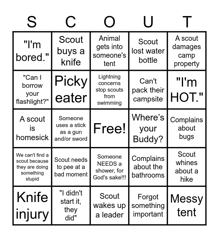 This bingo card has a free space and 24 words: Scout needs to pee at a bad moment, "I didn't start it, they did", Lightning concerns stop scouts from swimming, Knife injury, A scout damages camp property, "I'm bored.", "Can I borrow your flashlight?", Scout buys a knife, Where’s your Buddy?, Someone NEEDS a shower, for God's sake!!!, Can't pack their campsite, A scout is homesick, Complains about the bathrooms, Scout whines about a hike, Picky eater, Forgot something important, Complains about bugs, Animal gets into someone's tent, "I'm HOT.", Someone uses a stick as a gun and/or sword, Messy tent, We can't find a scout because they are doing something stupid, Scout lost water bottle and Scout wakes up a leader.