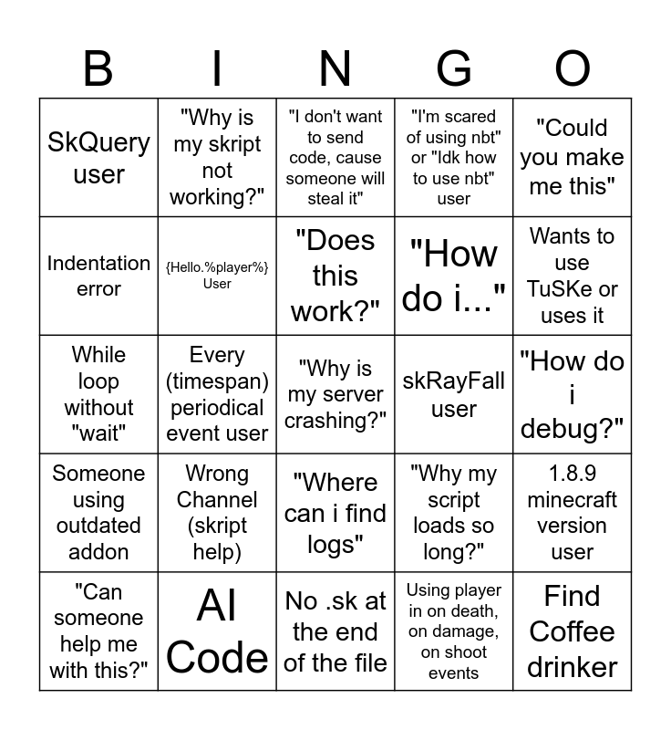 This bingo card has a free space and 24 words: Wrong Channel (skript help), AI Code, "Does this work?", "Can someone help me with this?", "Could you make me this", SkQuery user, Indentation error, "Why is my skript not working?", skRayFall user, "Where can i find logs", "How do i...", While loop without "wait", "Why my script loads so long?", 1.8.9 minecraft version user, {Hello.%player%} User, Using player in on death, on damage, on shoot events, "How do i debug?", "I don't want to send code, cause someone will steal it", Wants to use TuSKe or uses it, Every (timespan) periodical event user, Find Coffee drinker, Someone using outdated addon, "I'm scared of using nbt" or "Idk how to use nbt" user and No .sk at the end of the file.