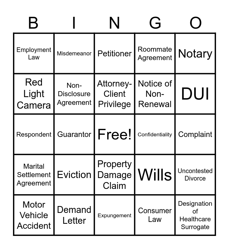 This bingo card has a free space and 47 words: Power of Attorney, Designation of Healthcare Surrogate, Name Change, Expungement, Eviction, Security Deposit, Misdemeanor, Speeding Ticket, Red Light Camera, Lease Agreement, Non-Disclosure Agreement, Roommate Agreement, Uncontested Divorce, Wills, Debt Collections, Bankruptcy, Attorney-Client Privilege, Confidentiality, Lease Review, Notary, Guarantor, Consumer Law, Employment Law, Notice of Non-Renewal, Early Termination Clause, DUI, Motor Vehicle Accident, Bodily Injury Claim, Property Damage Claim, Marital Settlement Agreement, Parenting Plan, Employment Contract, Speed Limit, Move-In Checklist, Move-Out Checklist, Demand Letter, Complaint, Answer, Filing Fee, Landlord, Tenant, Petitioner, Respondent, Florida Bar, Florida Statutes, Litigation and Final Judgment.