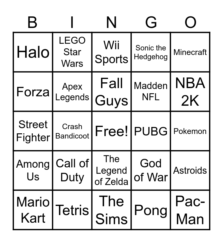 This bingo card has a free space and 39 words: Super Smash Bros, Animal Crossing, Fortnite, Apex Legends, Mario Kart, The Legend of Zelda, Fall Guys, Roblox, Minecraft, Among Us, Crash Bandicoot, Sonic the Hedgehog, Pac-Man, Pokemon, PUBG, Call of Duty, League of Legends, Halo, Final Fantasy, God of War, Forza, The Sims, Madden NFL, NBA 2K, Marvel Rivals, Overwatch, Spyro, Donkey Kong, Splatoon, LEGO Star Wars, DOTA2, Just Dance, Wii Sports, Tetris, Pong, Frogger, Astroids, Street Fighter and Tekken.